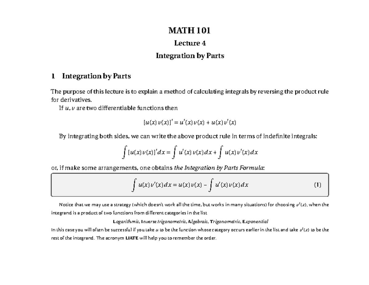 MATH 101 Lecture 4: Integration by Parts Explained - Studocu