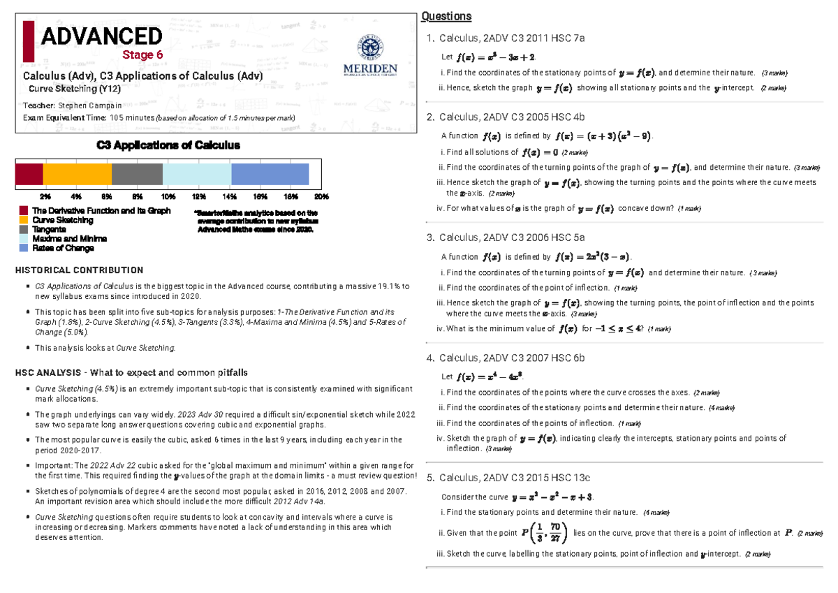 Applications of Calculus (Adv) - Curve Sketching HSC Questions - Studocu