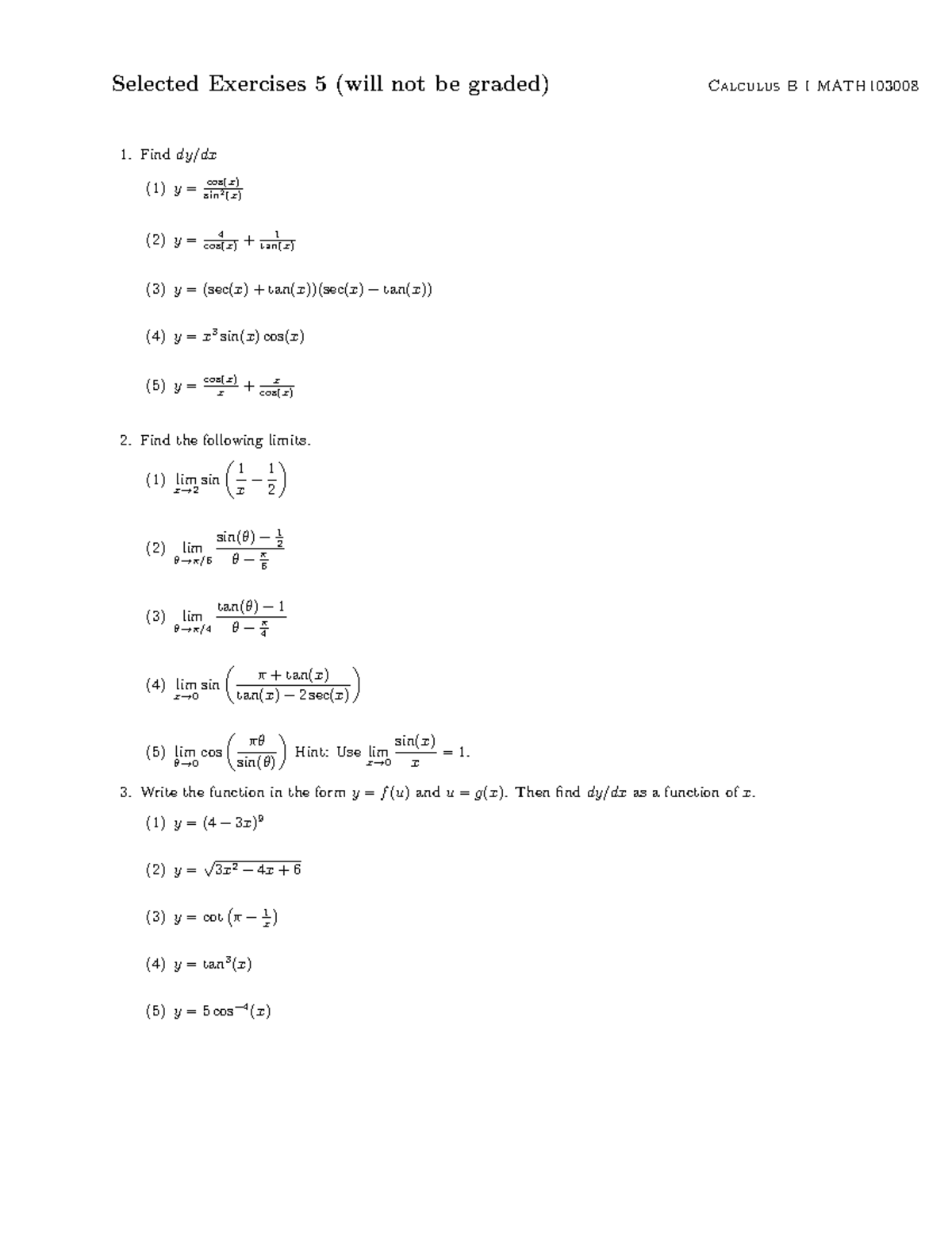 Selected Exercises 5 for Calculus B I (MATH103008) - Studocu