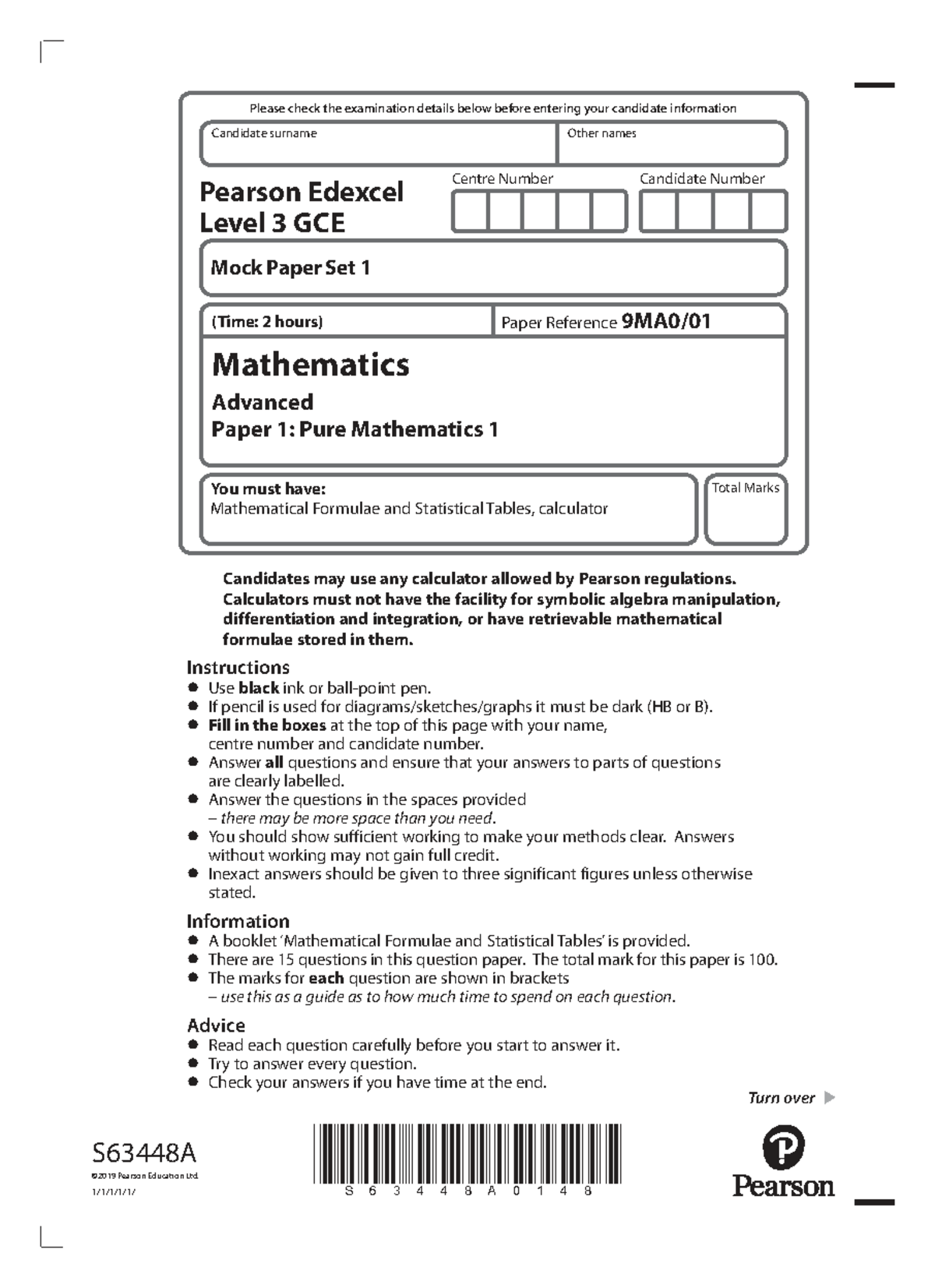 Mathematics Advanced Paper 1: Pure Mathematics 1 Mock Exam S63448A ...
