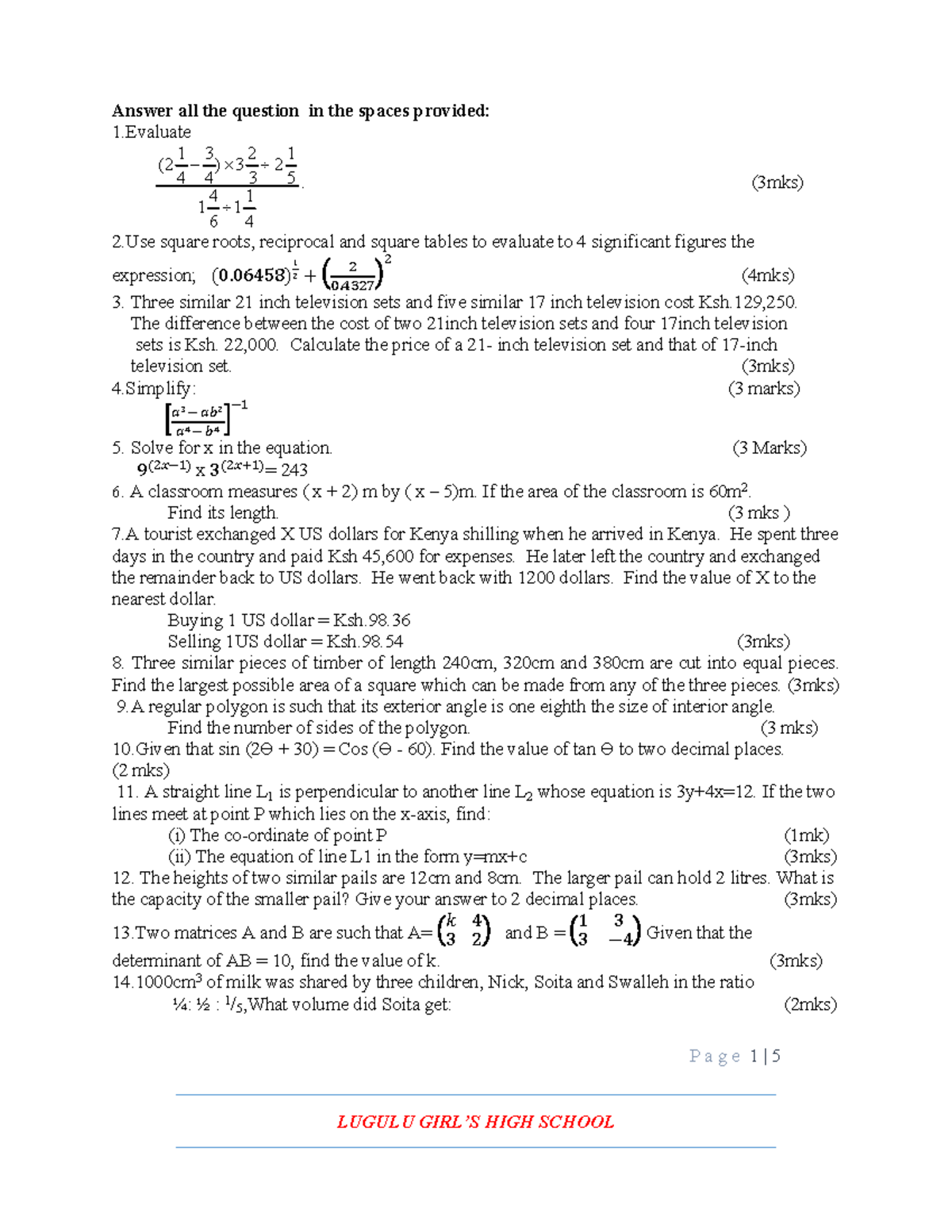 April 2026 Math Assignment - Form 3 - Mathematics Questions and ...