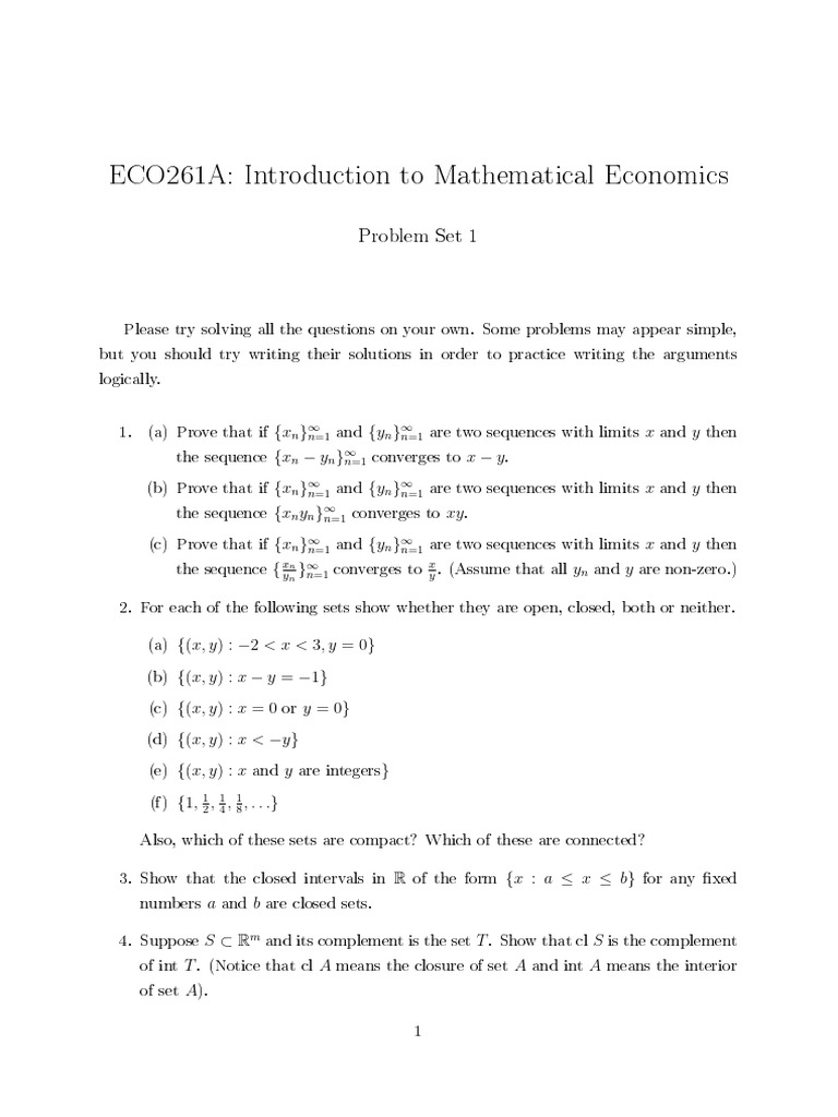 Mathematical Economics Problem Set 1 | PDF