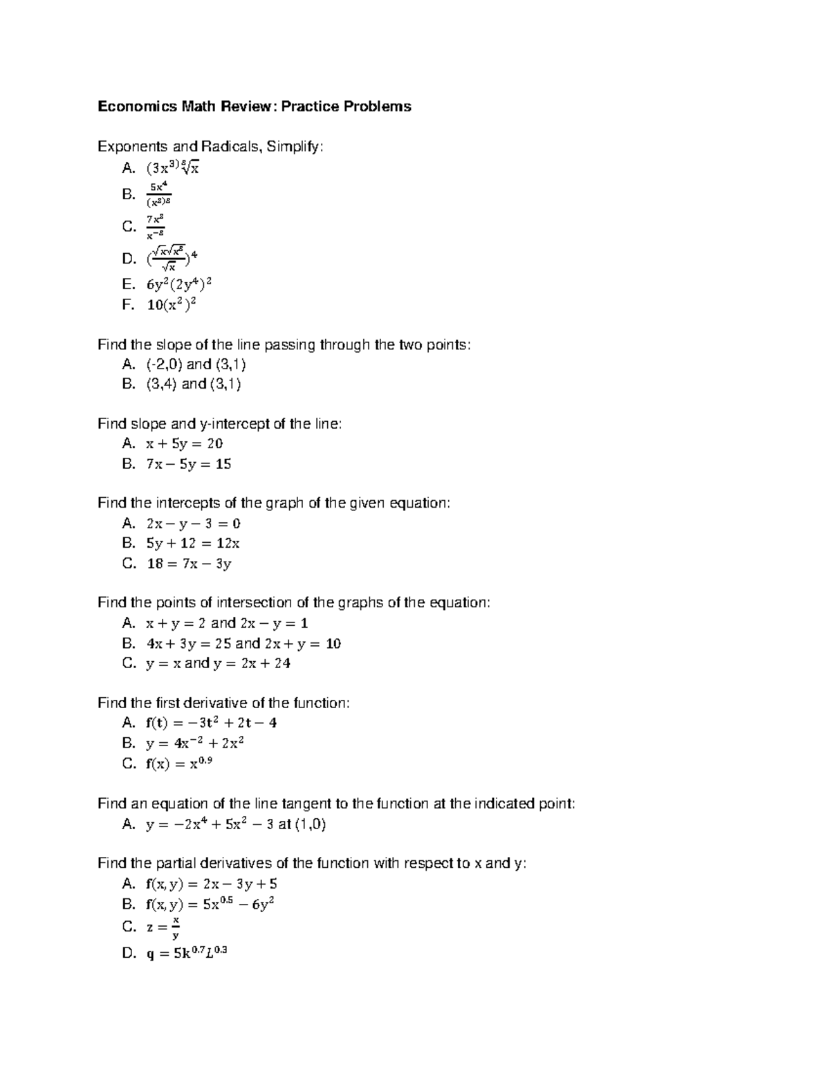 Handout Econ Math Review Practice Problems - Economics Math Review ...