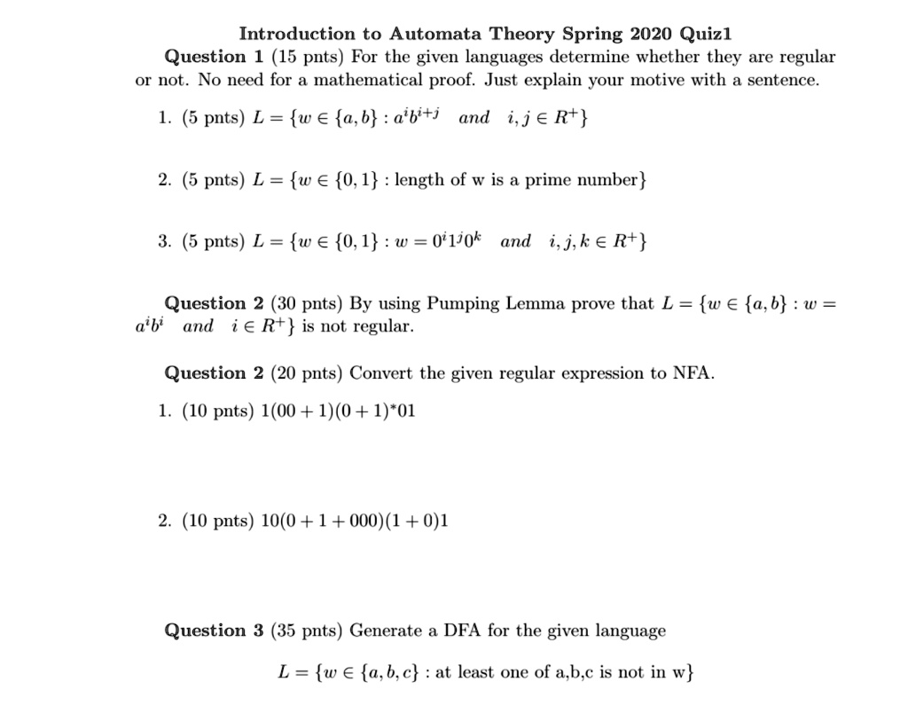 introduction to automata theory spring 2020 quiz question 1 15 pnts for ...