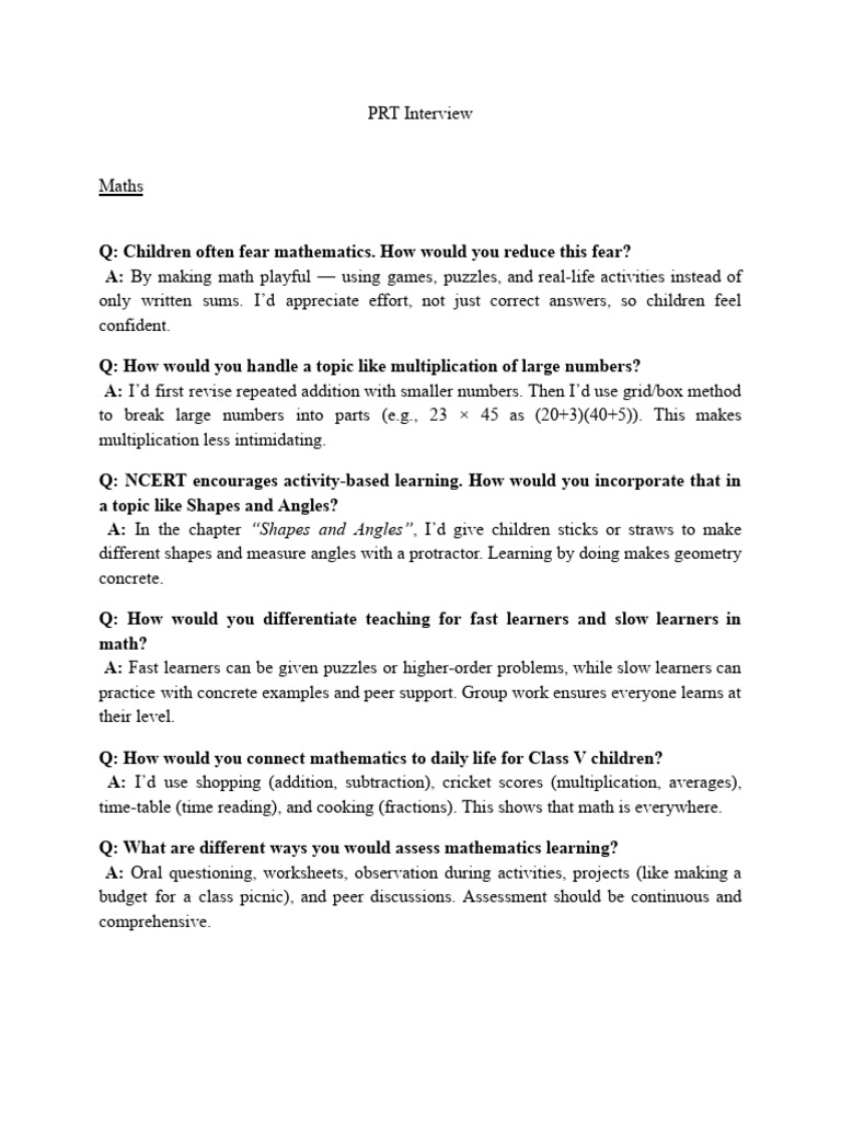 PRT Interview Questions | PDF | Mathematics | Learning