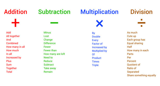 Symbols for addition, subtraction, multiplication, division, equals and ...