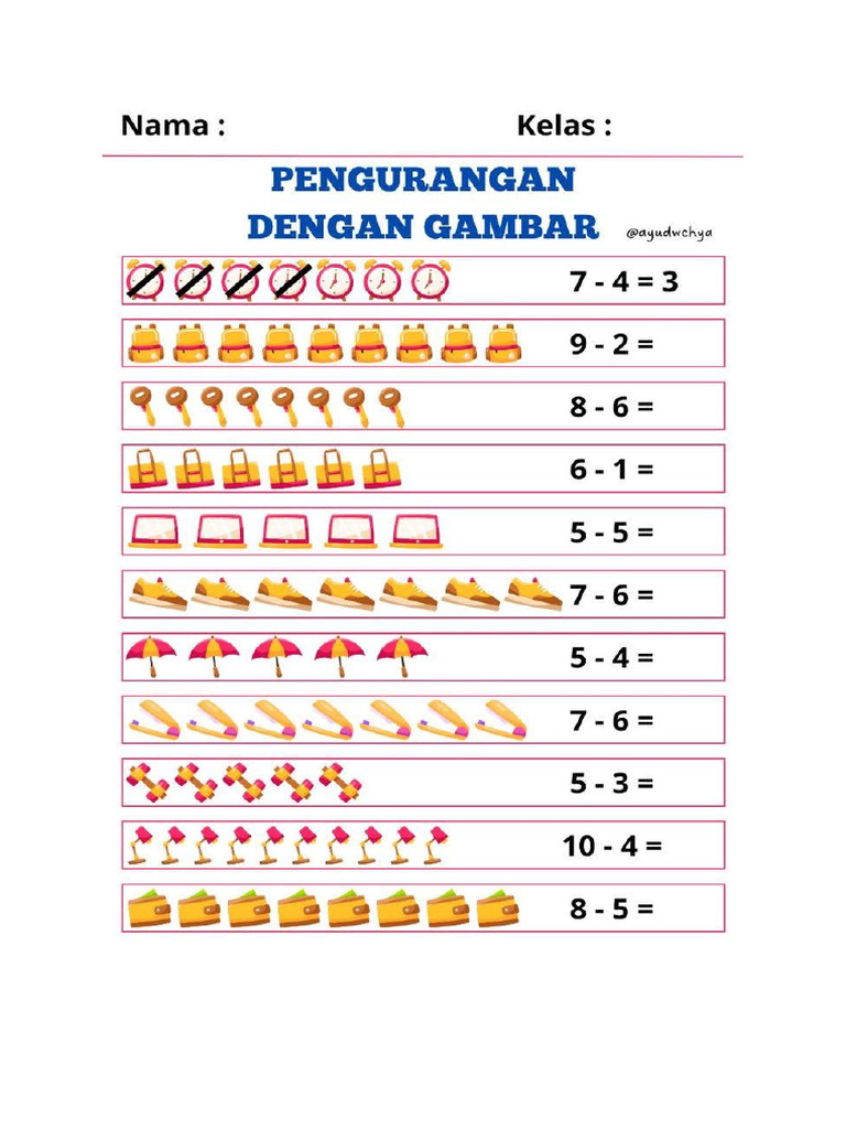 Penjumlahan & Pengurangan TK A | Kids math worksheets, Kids worksheets ...