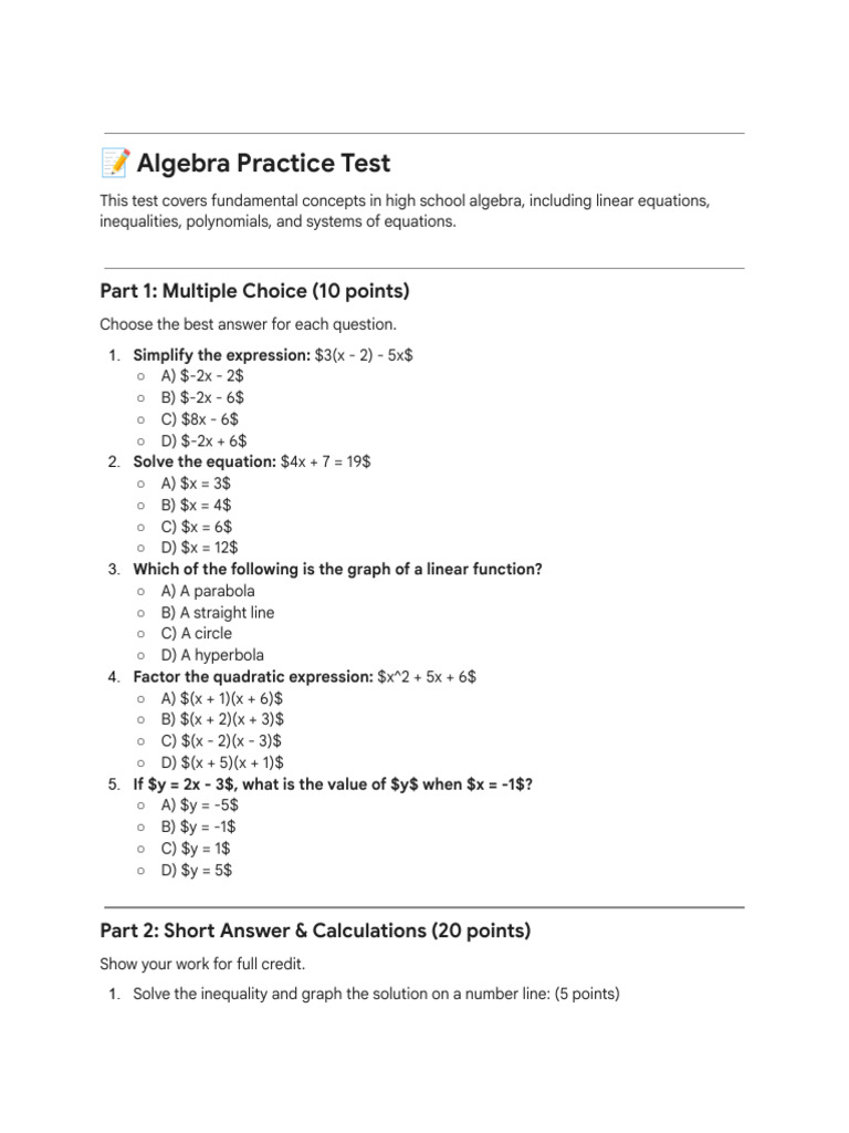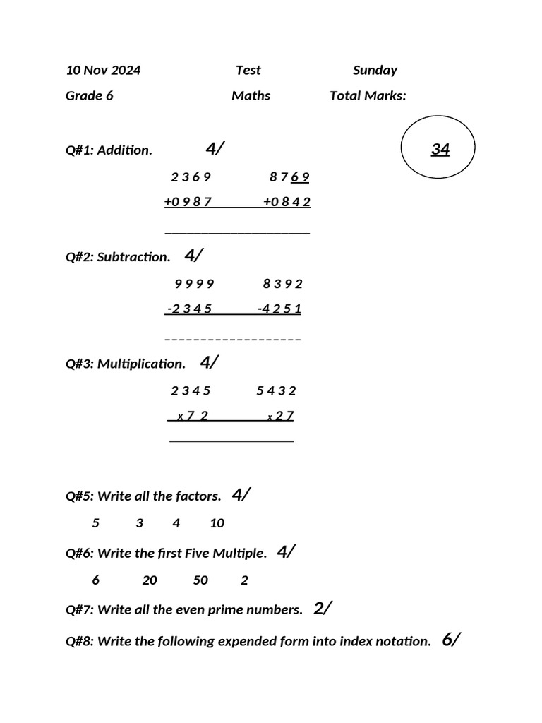 A Student's Math Test with Addition, Subtraction, Multiplication, and ...