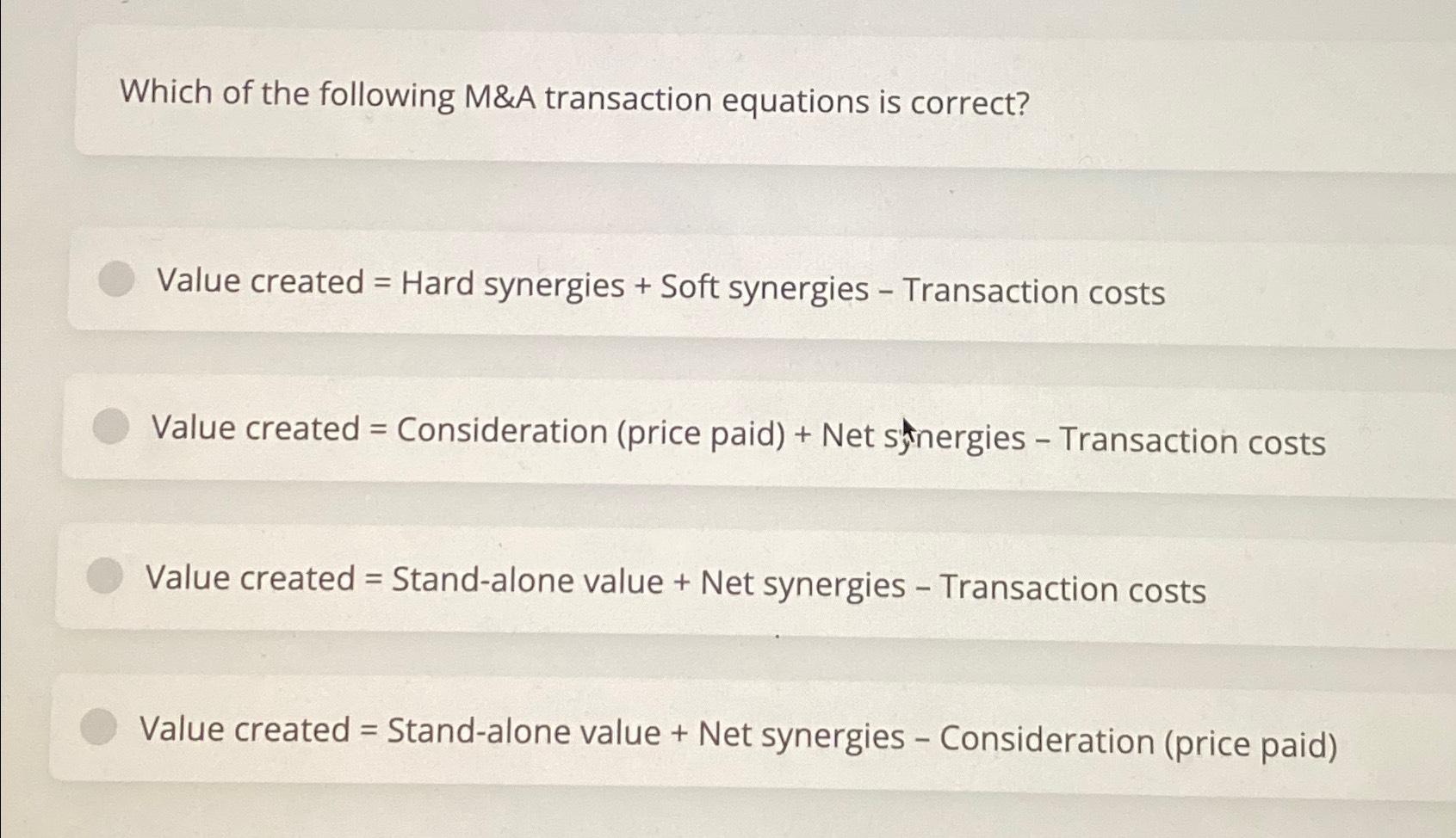 Solved Which of the following M&A transaction equations is | Chegg.com