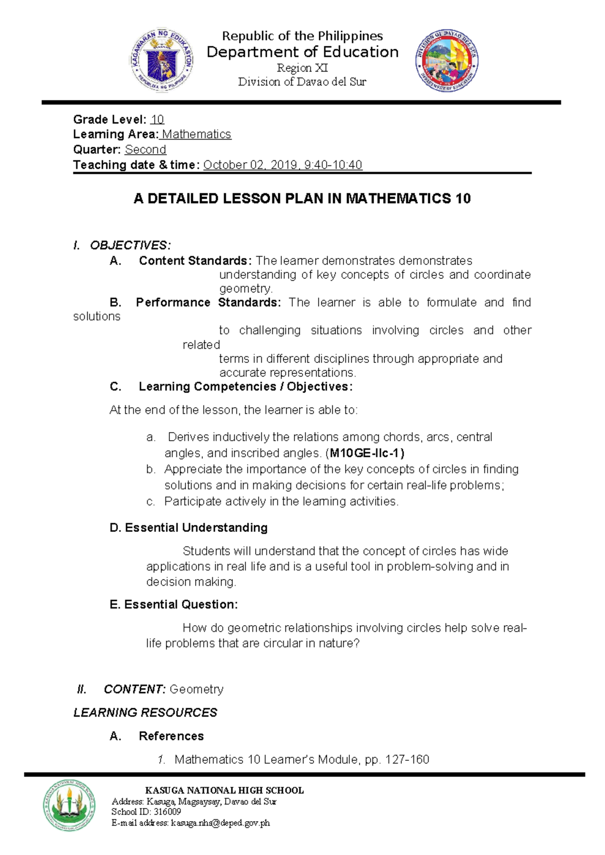 Detailed Lesson PLAN IN MATH 10 - Republic of the Philippines ...