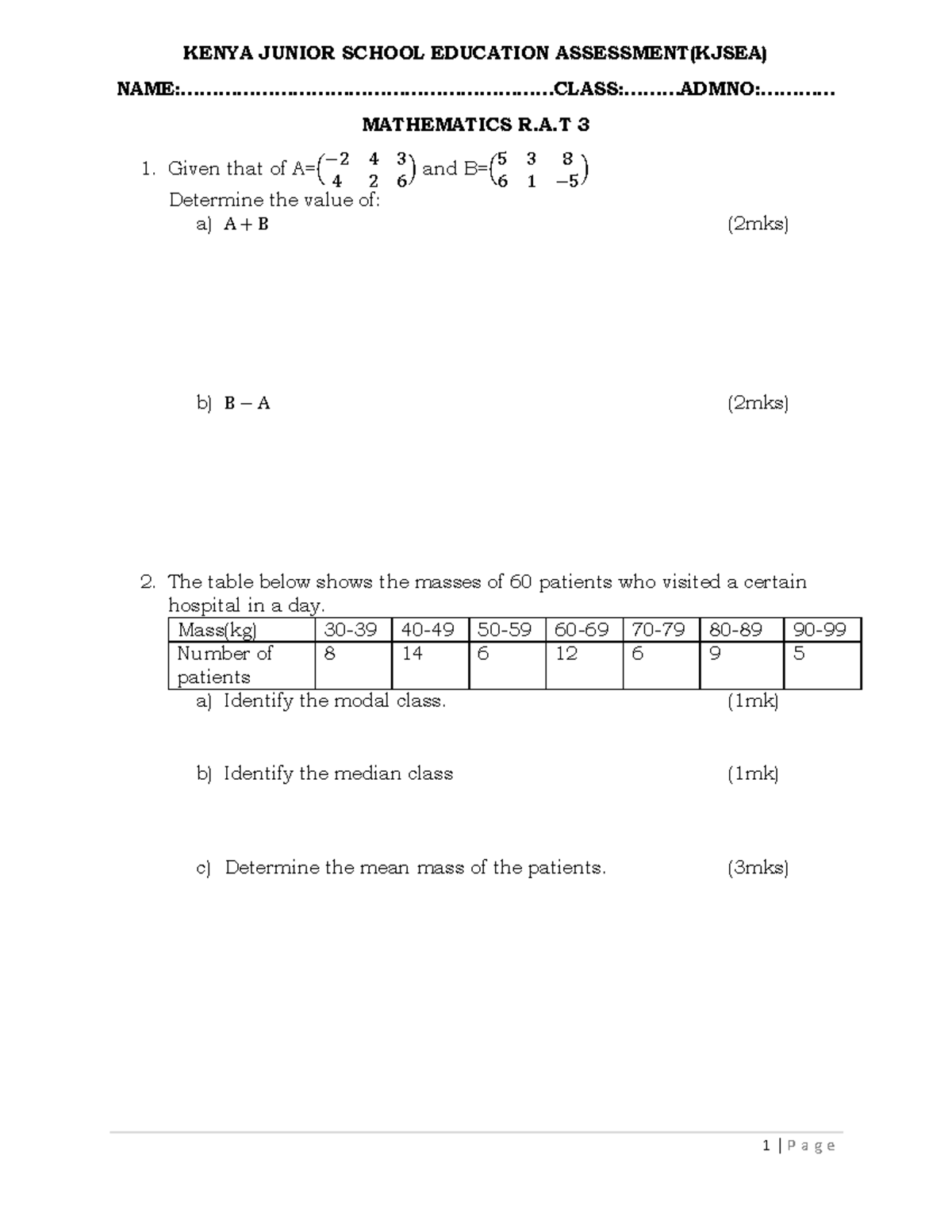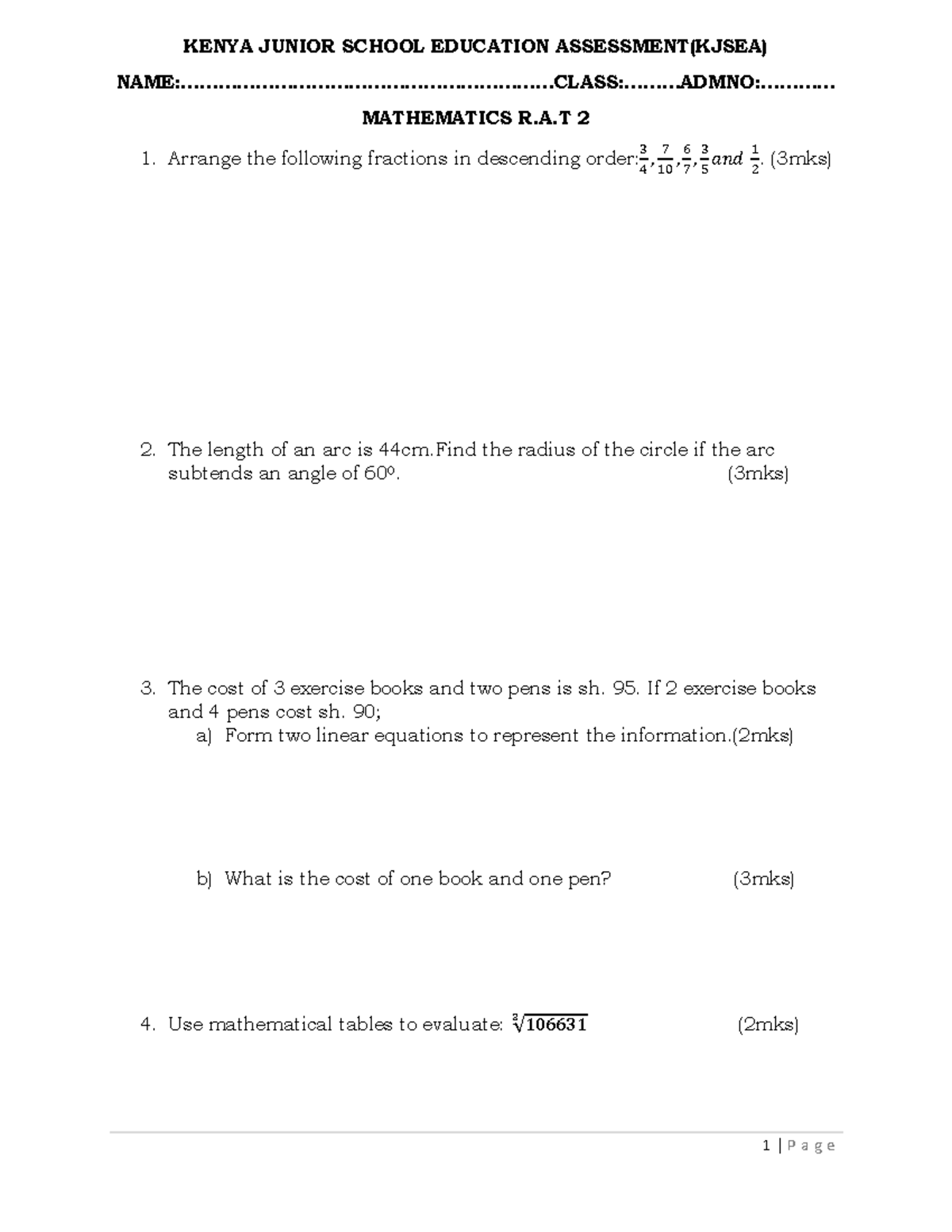 KENYA JUNIOR SCHOOL EDUCATION ASSESSMENT (KJSEA) MATH REVISION Qs - Studocu