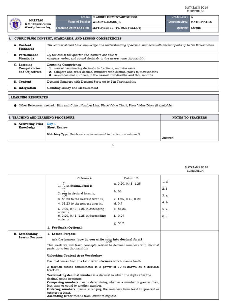 Math 5 Week 4: Decimals & Rounding | PDF | Arithmetic | Mathematics