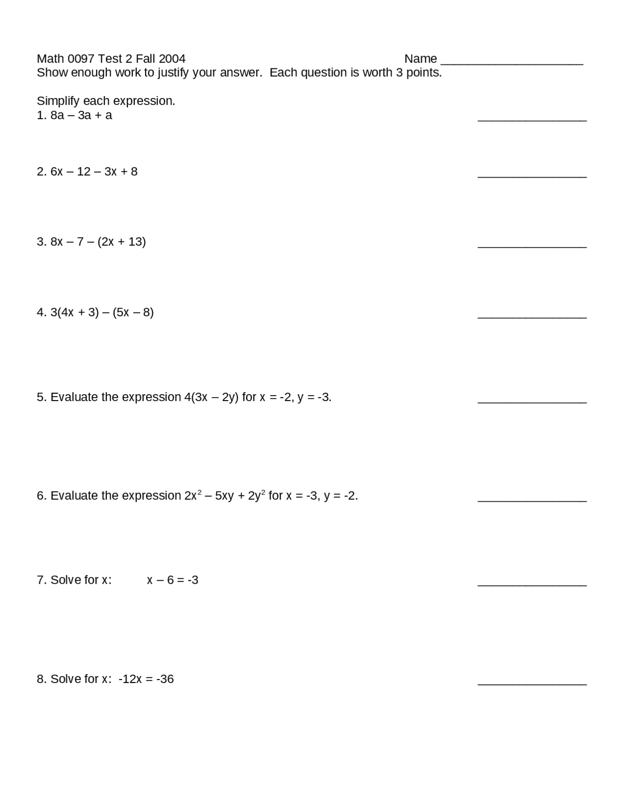 Exam 2 - Elementary Algebra - Fall 2004 | MATH 0097 - Docsity