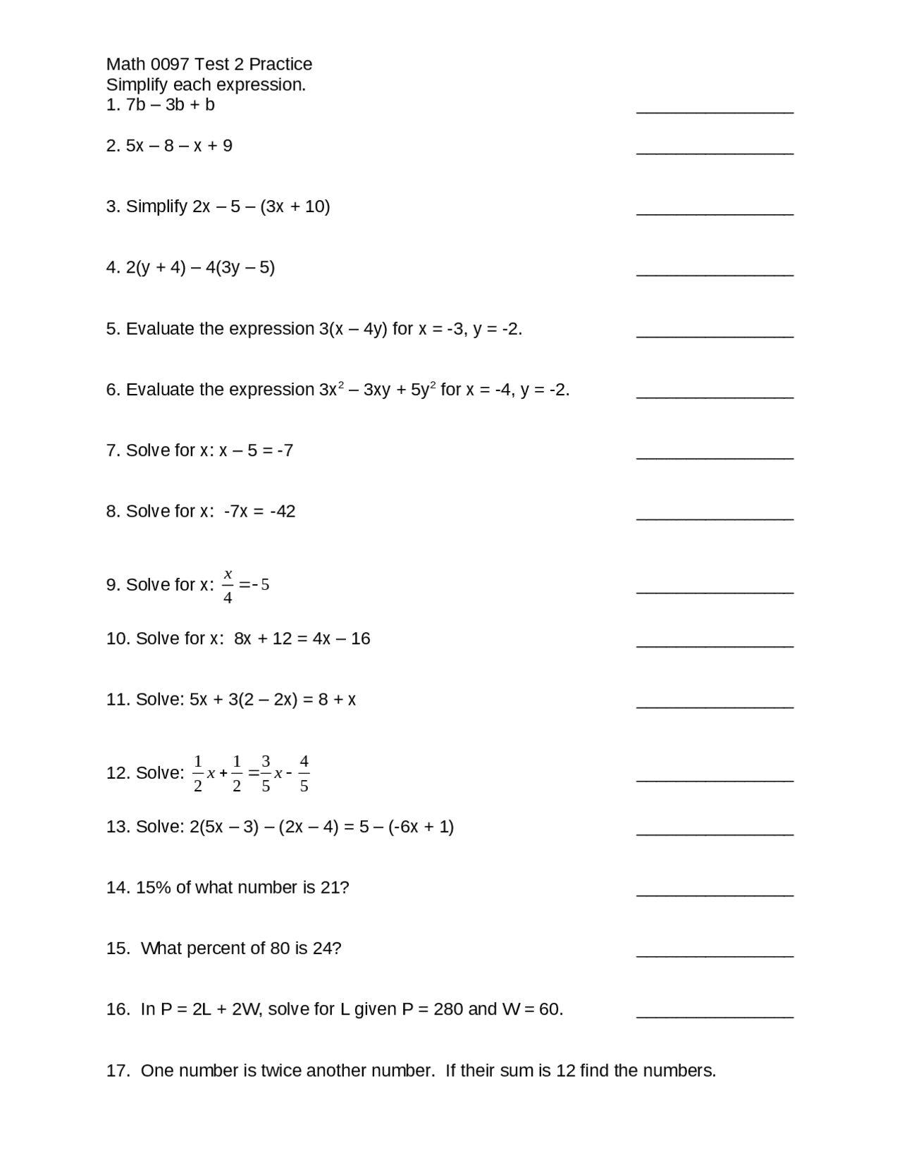 Final Examination Questions - Elementary Algebra | MATH 0097 - Docsity