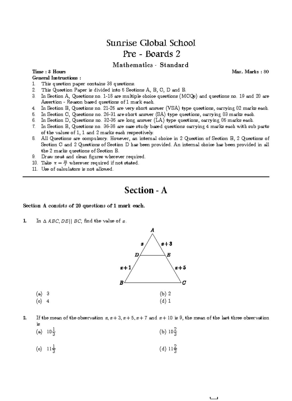 Mathematics Sample Paper - Standard - Class 10 - Preboard 2 Practice ...