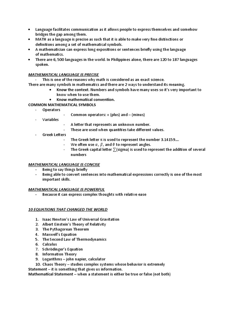 Mathematics Note: Key Terms on Precise Language and Relationships - Studocu