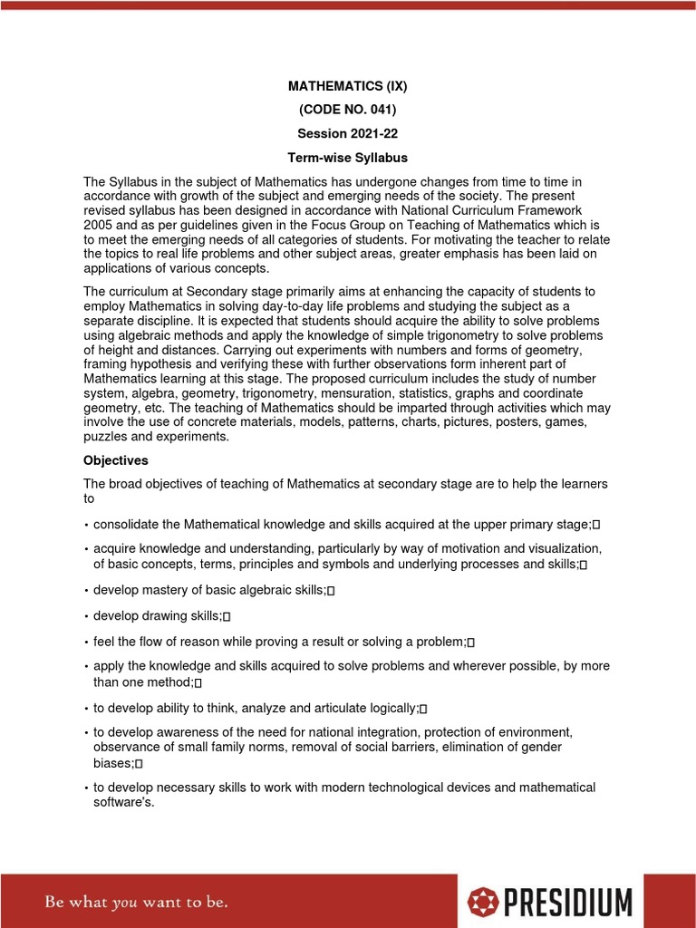 Mathematics (Ix) (CODE NO. 041) Session 2021-22 Term-Wise Syllabus ...