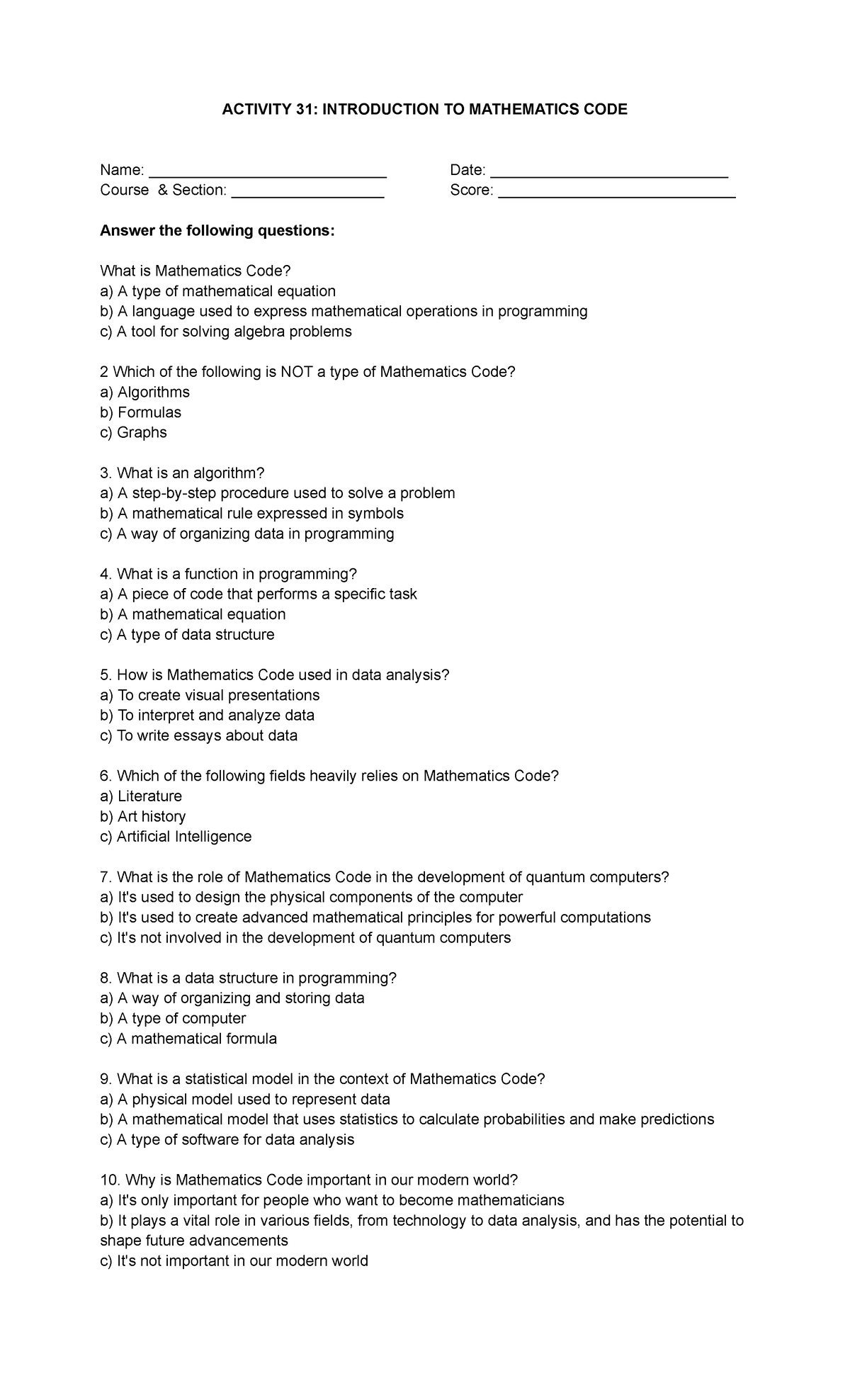 Math Code Worksheet: Engaging Activities to Sharpen Mathematical Skills