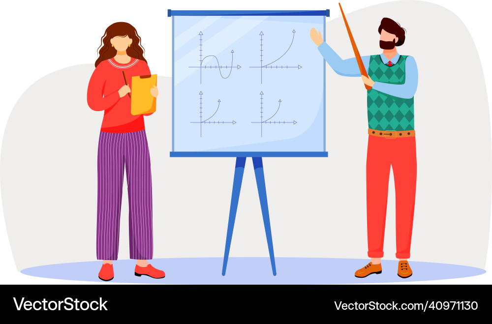 Teacher explains math graphs on whiteboard flat vector illustration ...