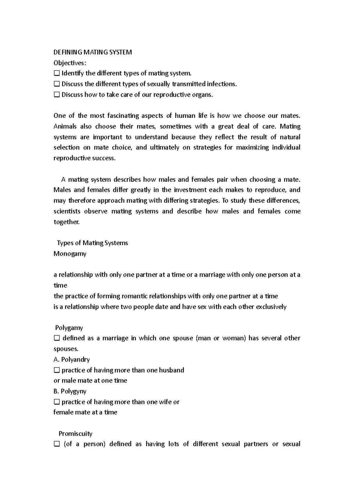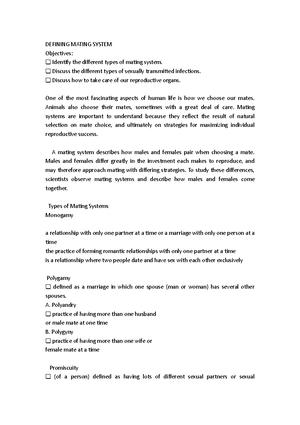 Defining Mating System - DEFINING MATING SYSTEM Objectives: Identify ...