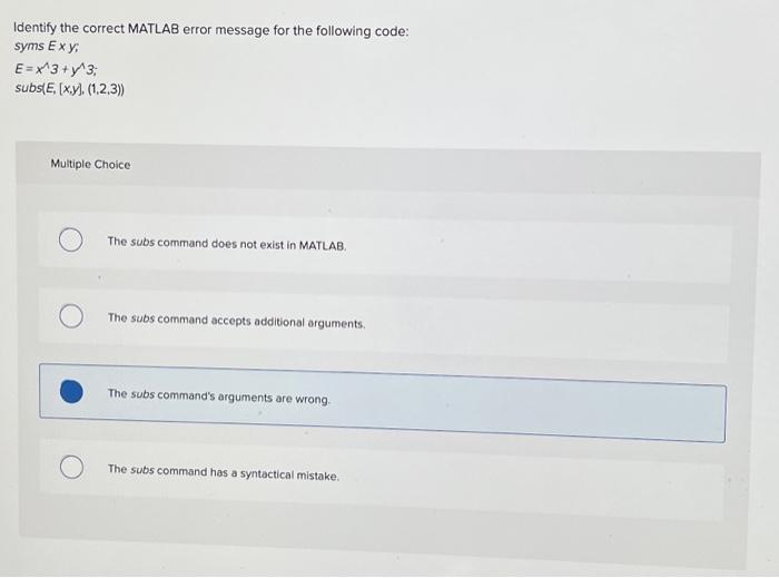 Solved Identify the correct MATLAB error message for the | Chegg.com