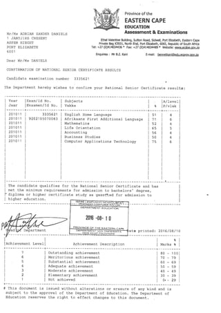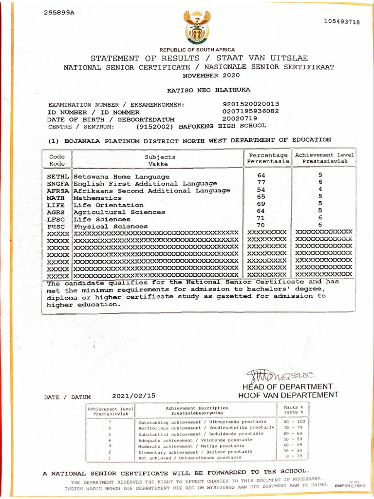 Matric statement and certificate