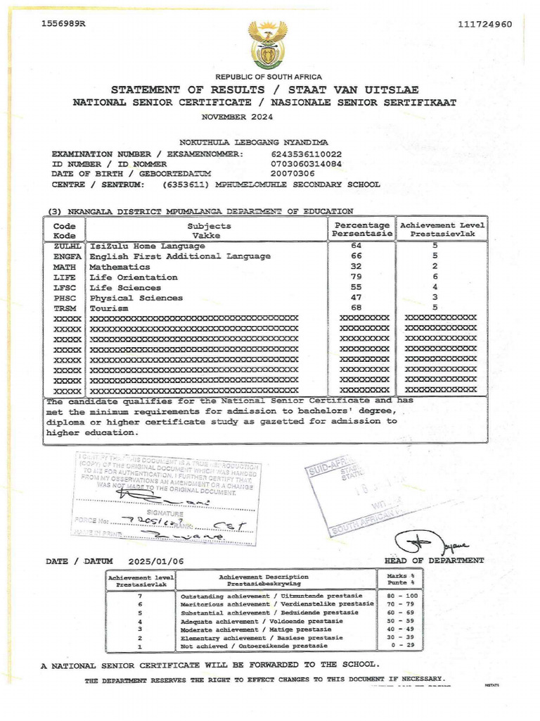 Nolitha matric statement - 20278716C 110583161 REPUBLIC OF SOUTH AFRICA ...