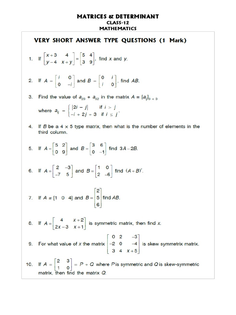 SOLUTION: Matrices test paper practice set 4 mathematics - Studypool
