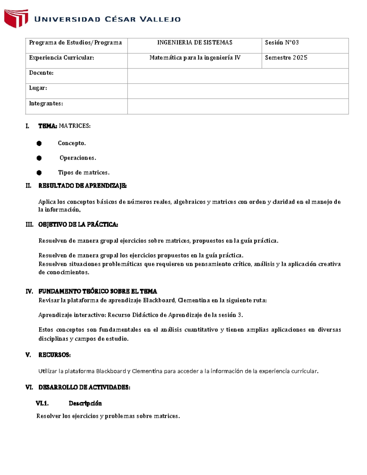 Guía 03: Tarea sobre Matrices - INGENIERIA DE SISTEMAS IV Semestre 2025 ...