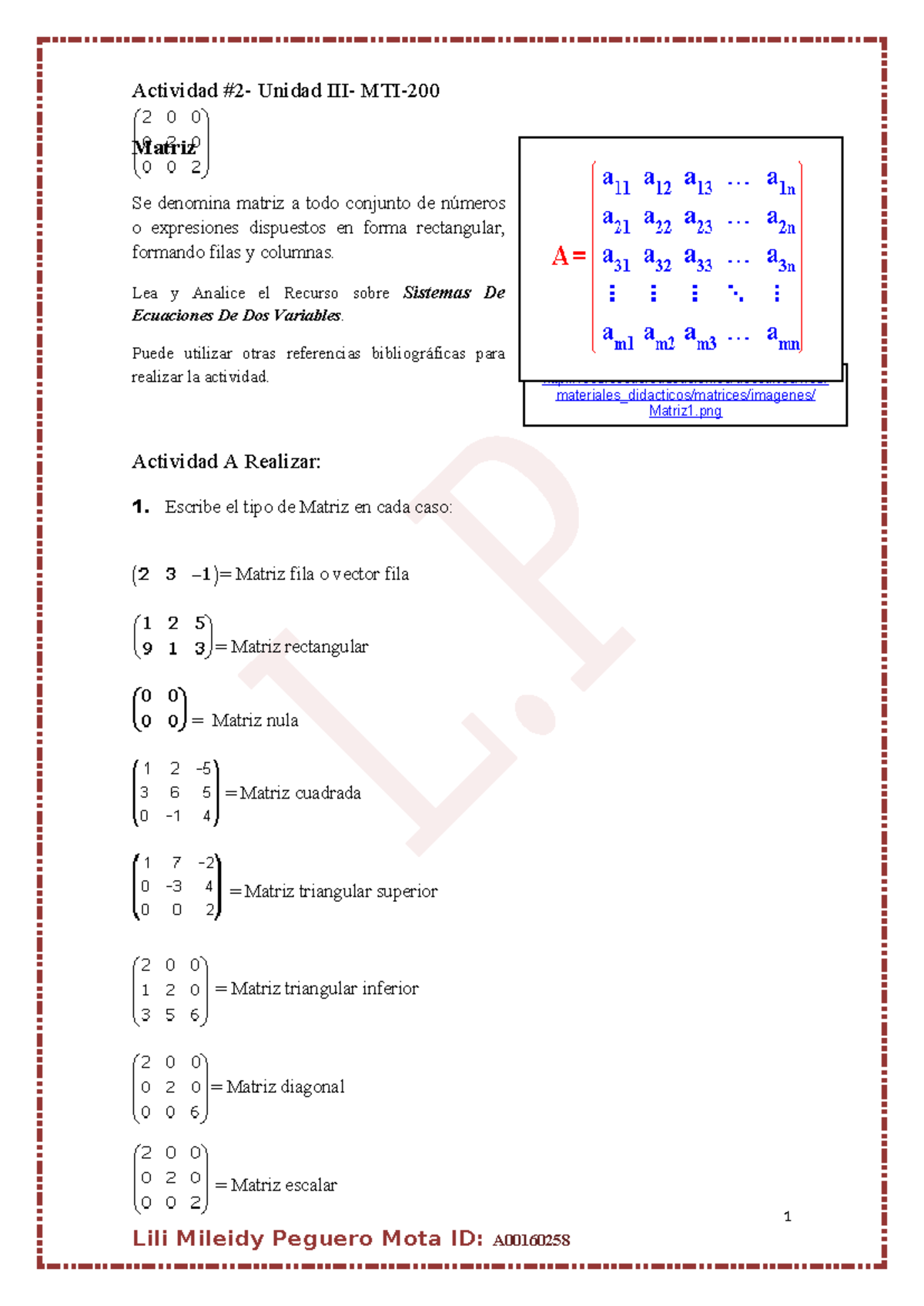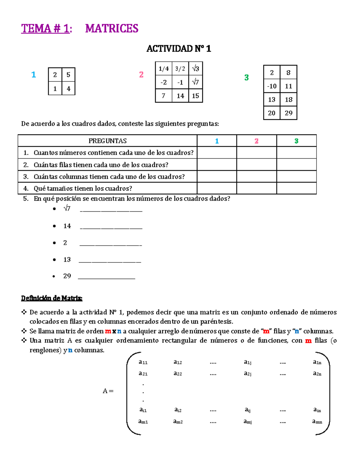 TEMA 1: MATRICES - ACTIVIDAD 1 Y TIPOS DE MATRICES - Studocu