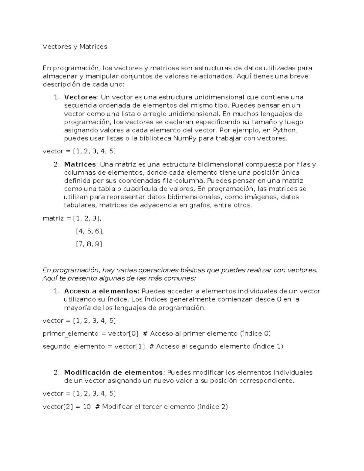 Vectores y Matrices en Programación: Estructuras y Operaciones ...