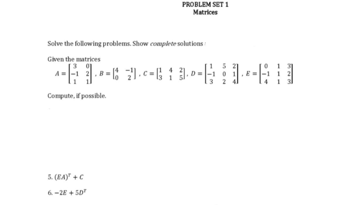 Solved PROBLEM SET 1 Matrices Solve the following problems. | Chegg.com