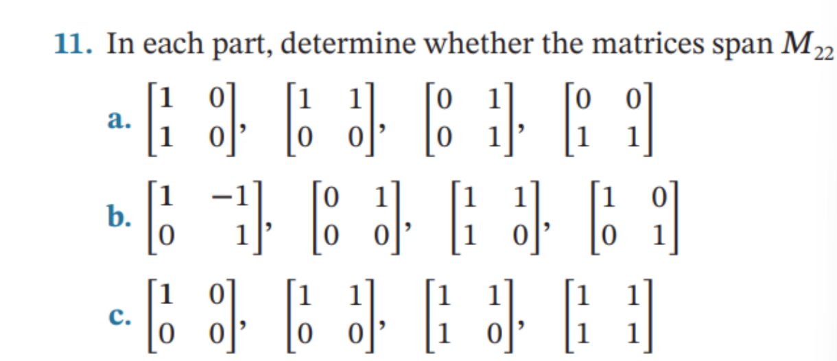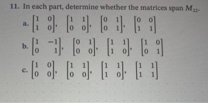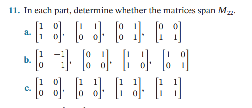 Solved 11. In each part, determine whether the matrices span | Chegg.com
