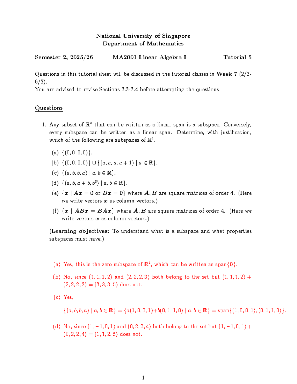 MA2001 Linear Algebra I Tutorial 5: Subspaces in R4 Analysis - Studocu