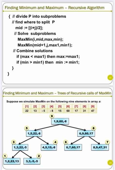 Finding Minimum and Maximum - Recursive Algorithm { | Chegg.com