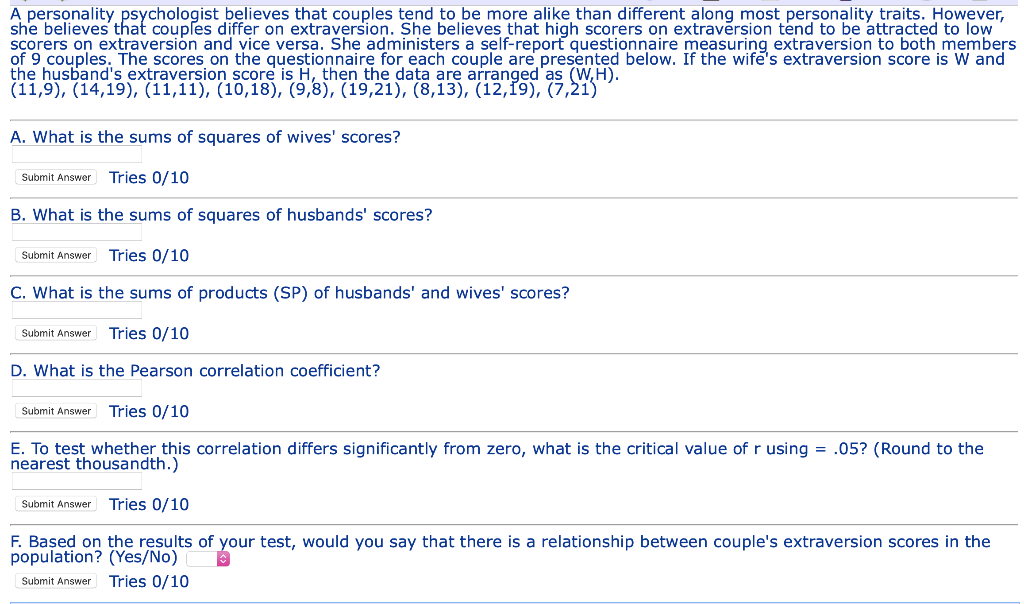 Solved A personality psychologist believes that couples tend | Chegg.com
