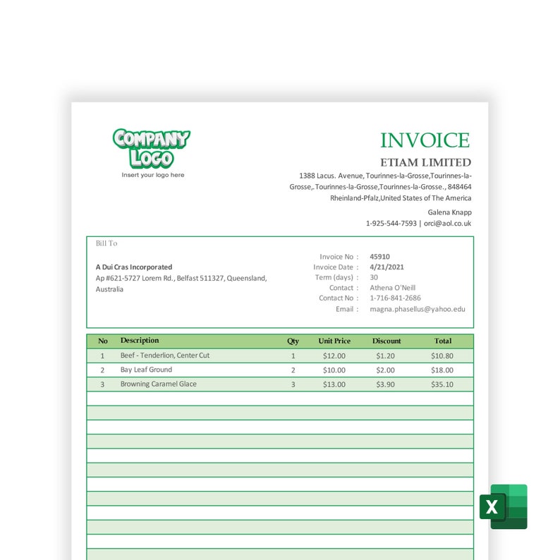 Food Invoice Template Excel