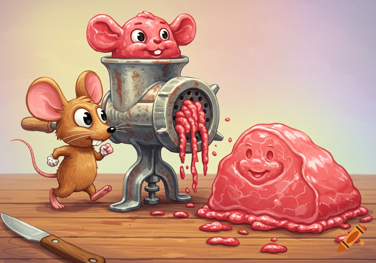 A cartoon brown mouse next to a meat grinder, from which emerges a ...