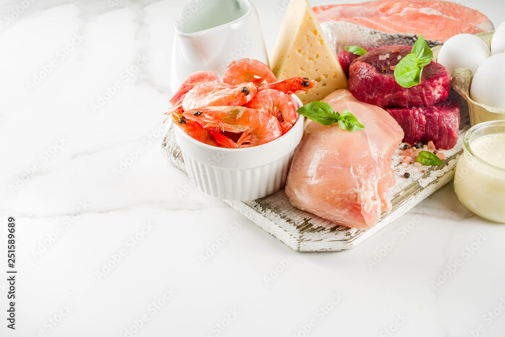 Assortment of natural sources of protein from food: meat, fish, chicken ...