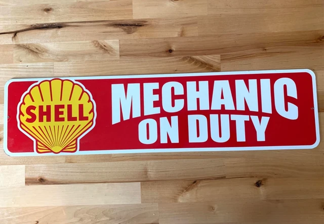 SHELL GAS SERVICE STATION Sign Tin Metal Decal SHELL MECHANIC ON DUTY ...