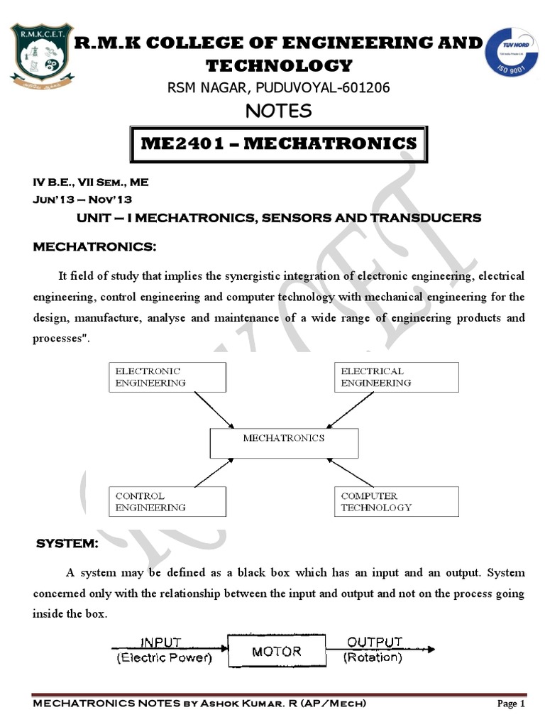 Download Introduction To Mechatronics Notes For Engineering by Vikrant ...