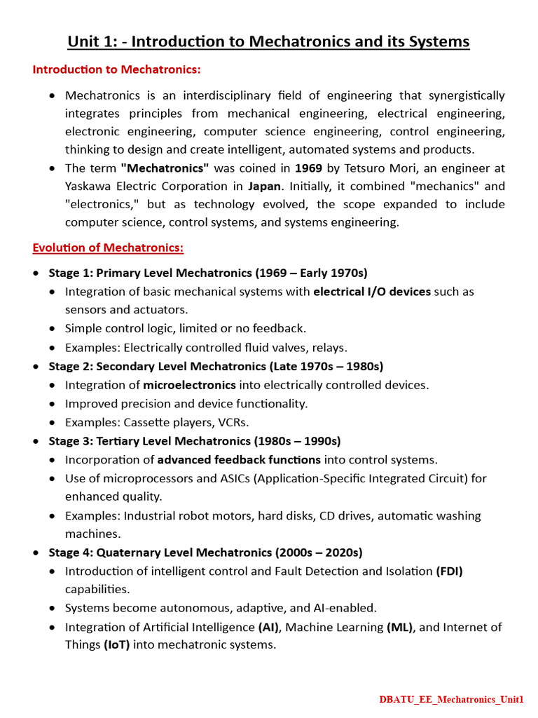 MECHATRONICS UNIT 1.pdf - Mechatronics - Notes - Teachmint