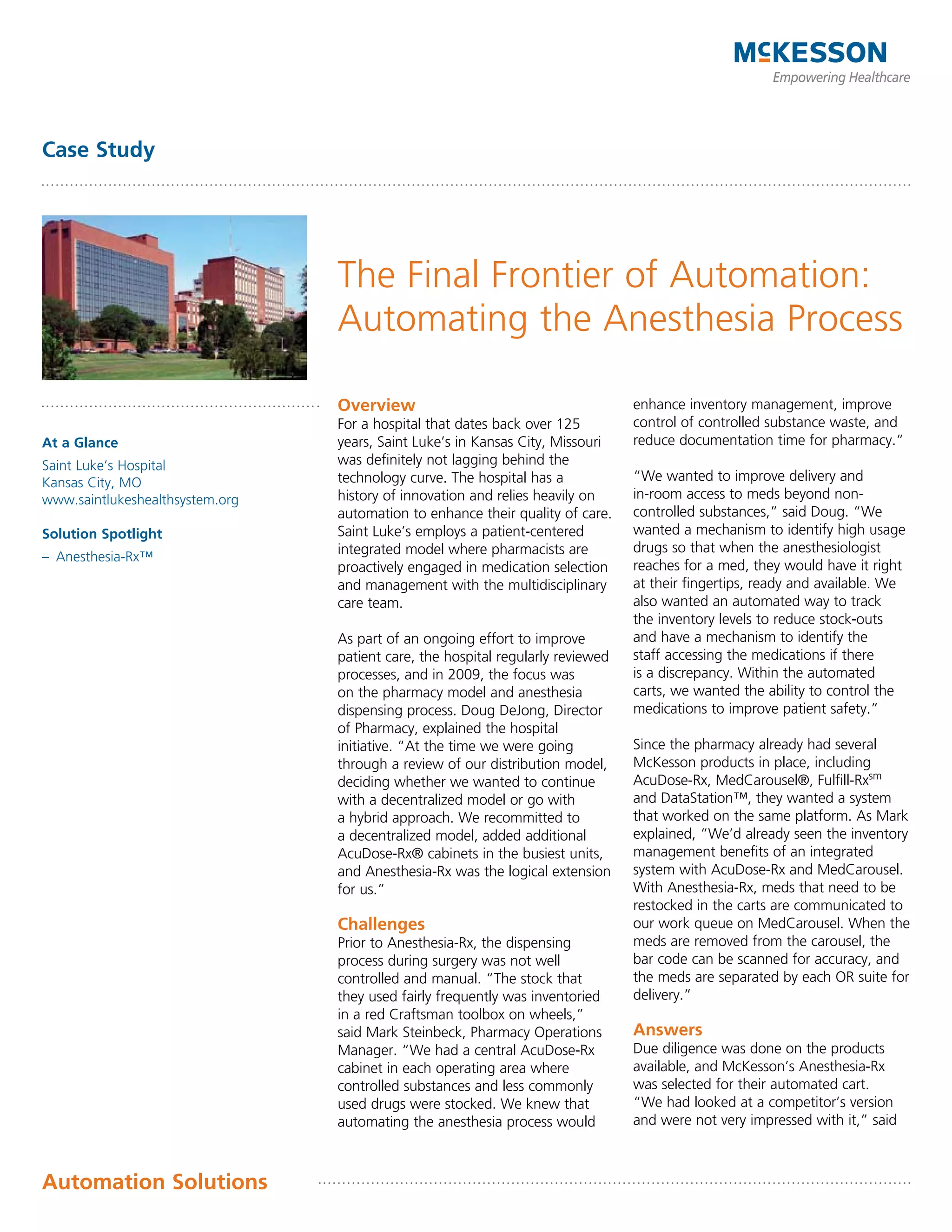 Case study stlukes(anesthesia)-the final frontier of automation | PDF