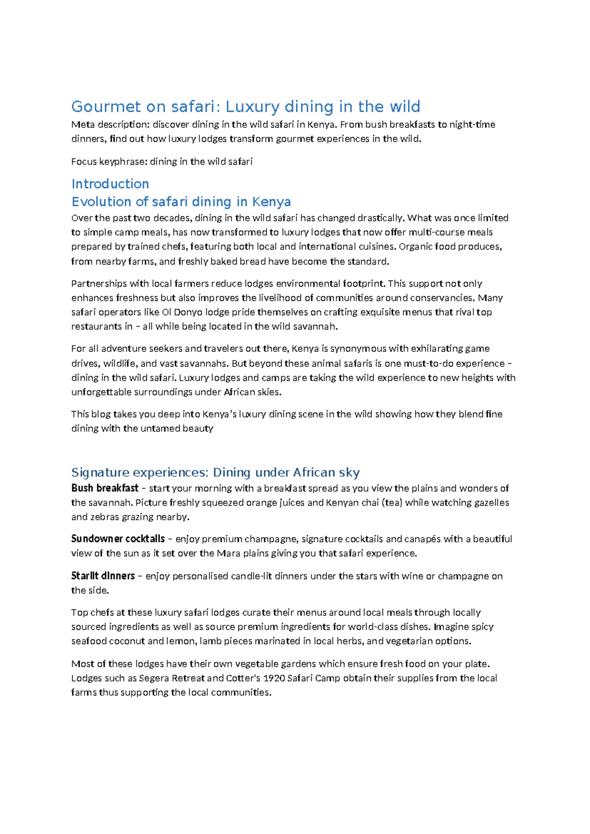 Gourmet on Safari: Luxury Dining in the Wild - Kenya Notes - Studocu