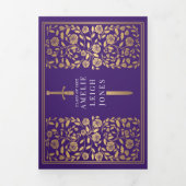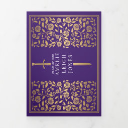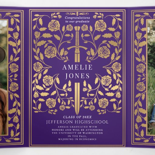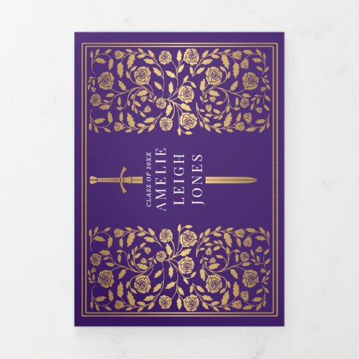 Purple Medieval Sword Photo Graduation Party Tri-Fold Invitation | Zazzle