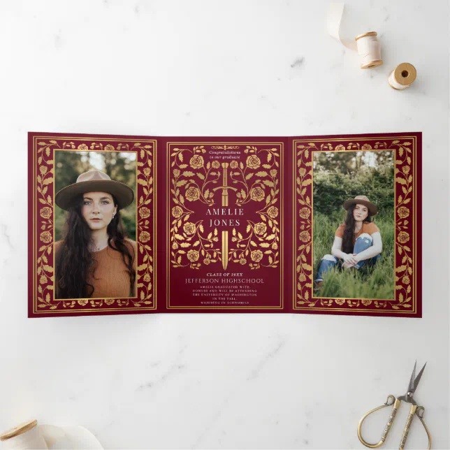 Red Royal Medieval Sword Photo Graduation Party Tri-Fold Invitation ...