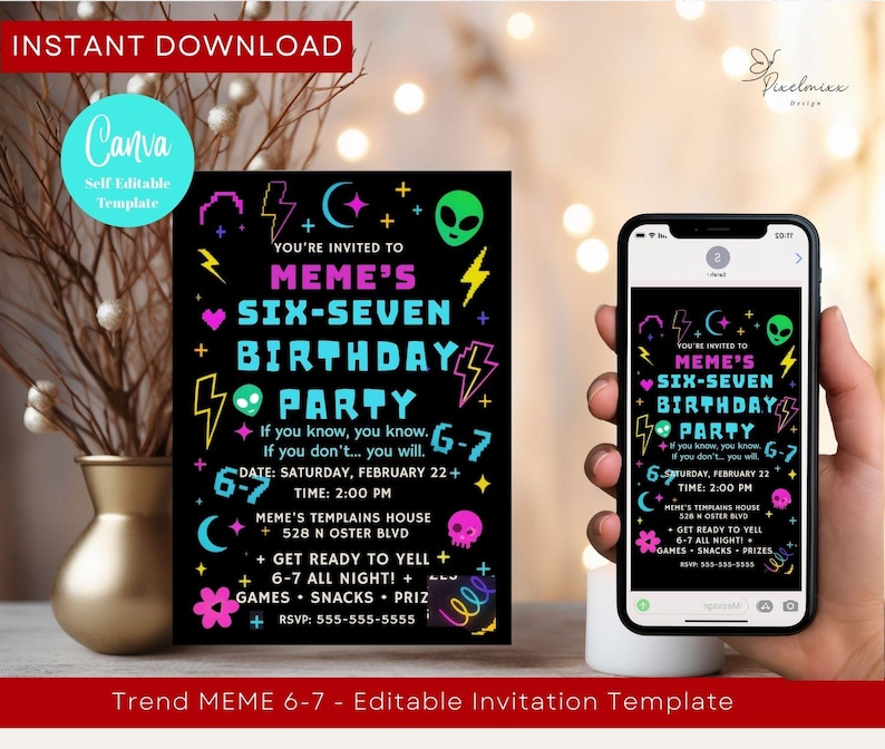 6 7 Meme Birthday Invitation Canva Template Teen Party Editable ...