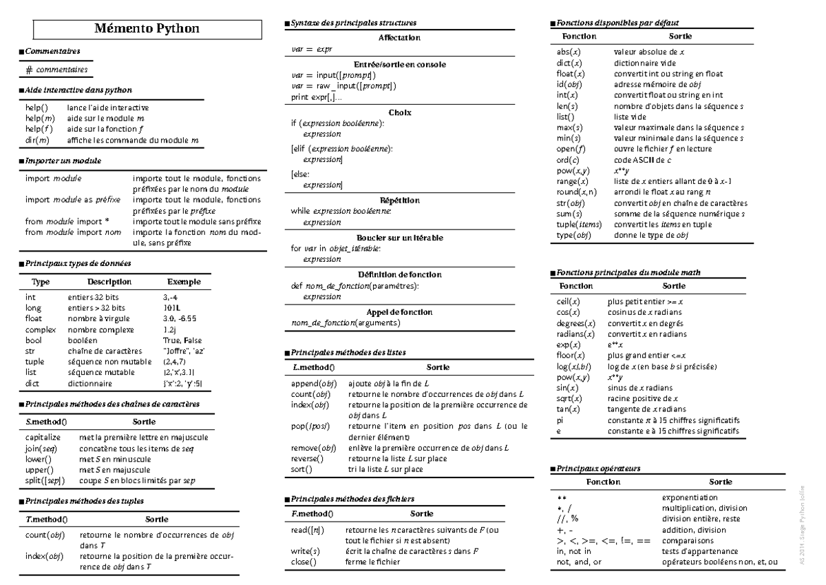 Résumé Python - Mémento Python Commentaires # commentaires Aide ...