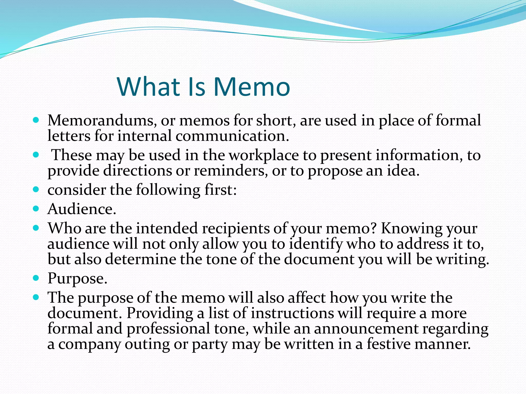 Audience and Purpose Parts of a Memo | Slides Business English - Docsity