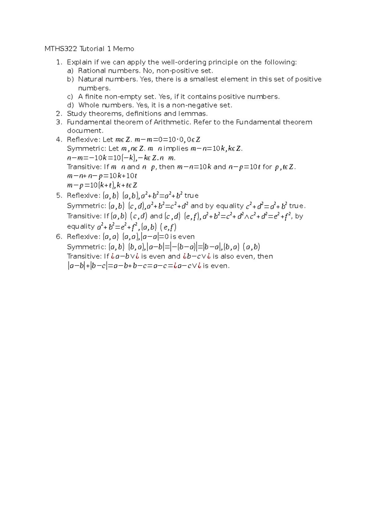 MTHS322 Tutorial 1 Memo: Principles of Number Sets Explained - Studocu